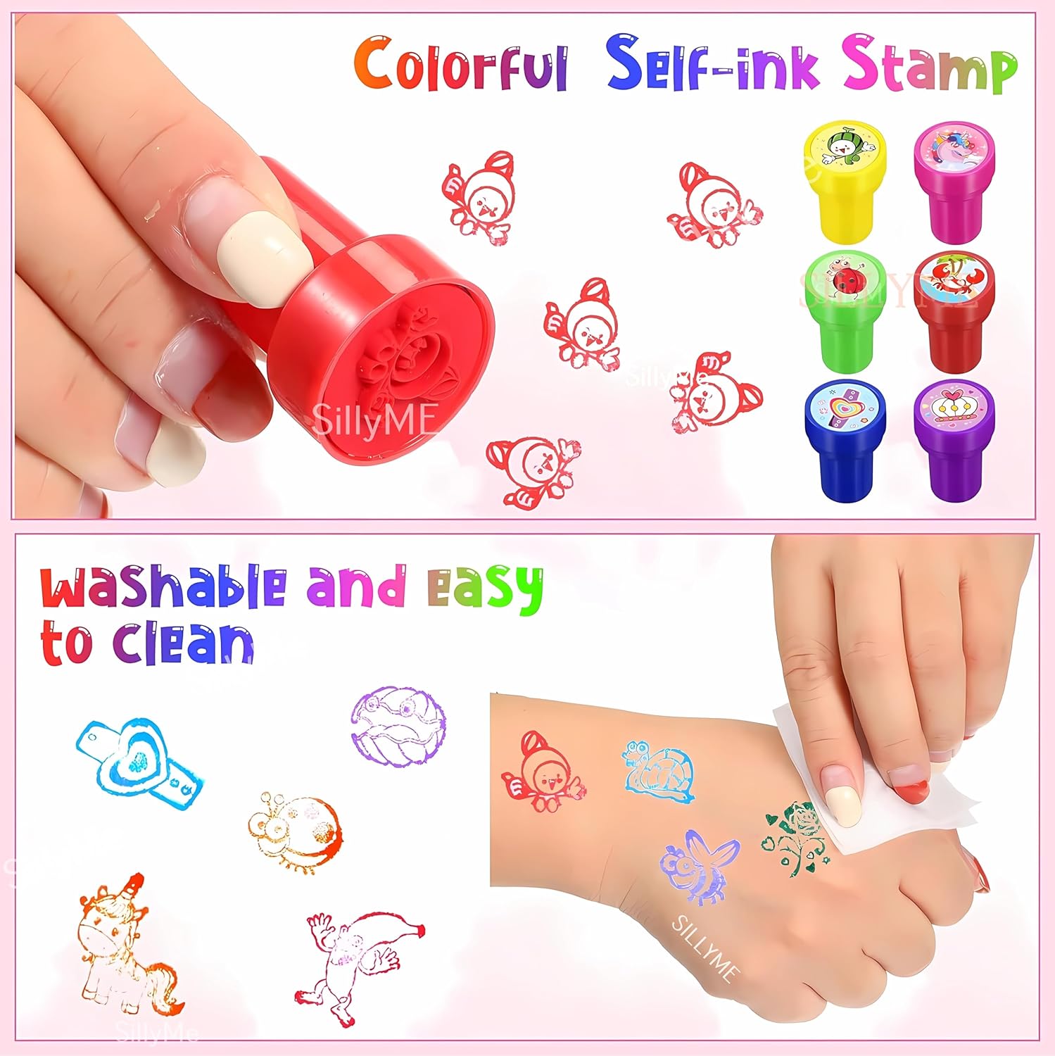 - return gift for kids birthday – Easy and Safe to use – Just open the cap of the sticker and softly press it against paper / hand / wall to get an impression of sticker . Easy to clean , made of material – rubber, paper stamp .