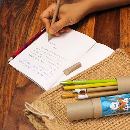 - SUSTAINABLE MATERIAL: Packaging, notepad, pen, and pencils body are made with recycled and bio-degradable paper, packed in a stylish jute bag.